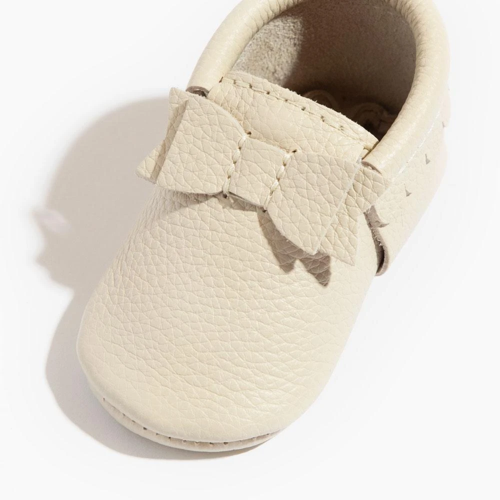 Creamy perfection! Our new bow moccasins feature a sweetly scalloped collar topped with a delicate bow. Made of with our favorite Birch, full-grain leather on the upper and sole, designed to go with everything.