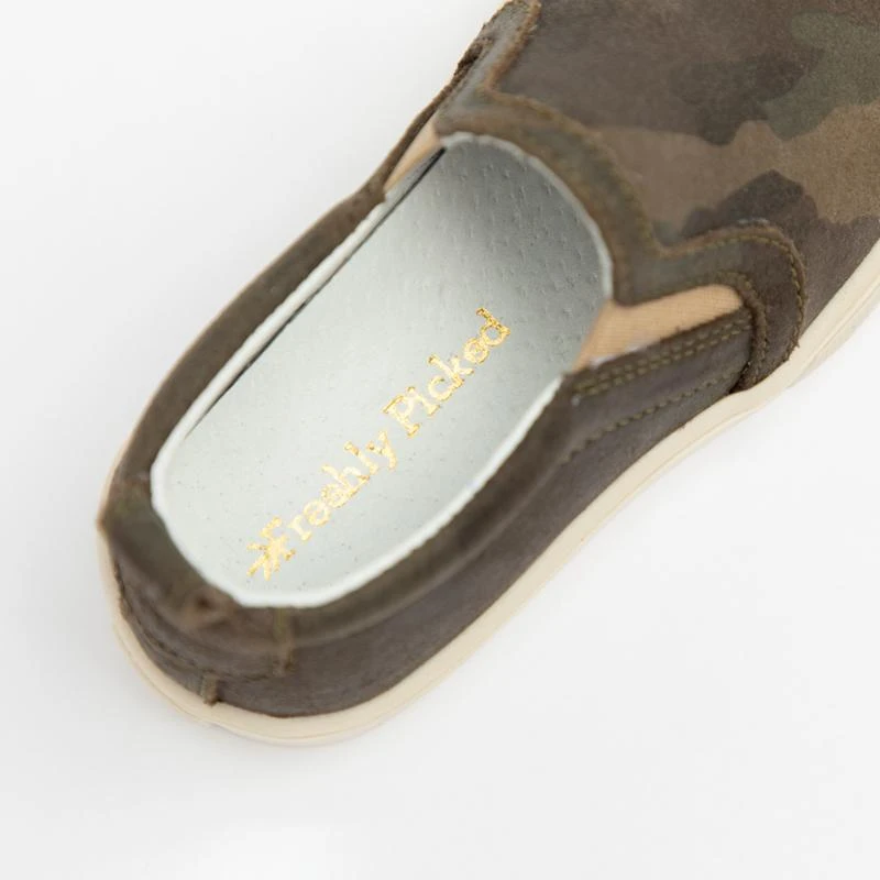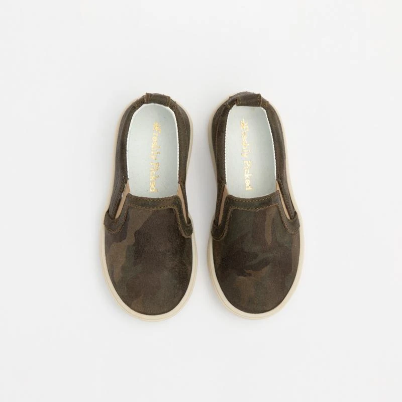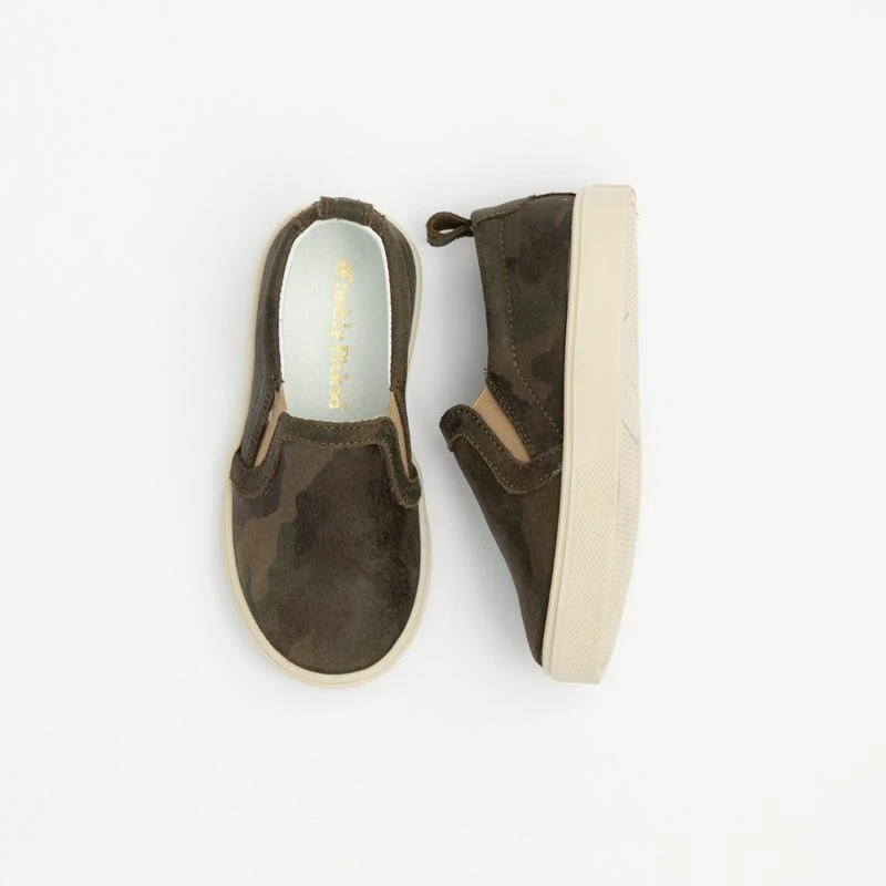 For the NEXT step in your kid’s life, slip into our brand-new Slip-On Sneakers! You asked for print shoes and we listened! Introducing our first print shoe made with camo genuine suede leather, textured rubber soles, a back pull tab, and stretchy elastic openings for an easy-on and off experience. There won’t be any slipping and sliding in these puppies! Best part they can match their baby bro or sis in our matching moccasins!