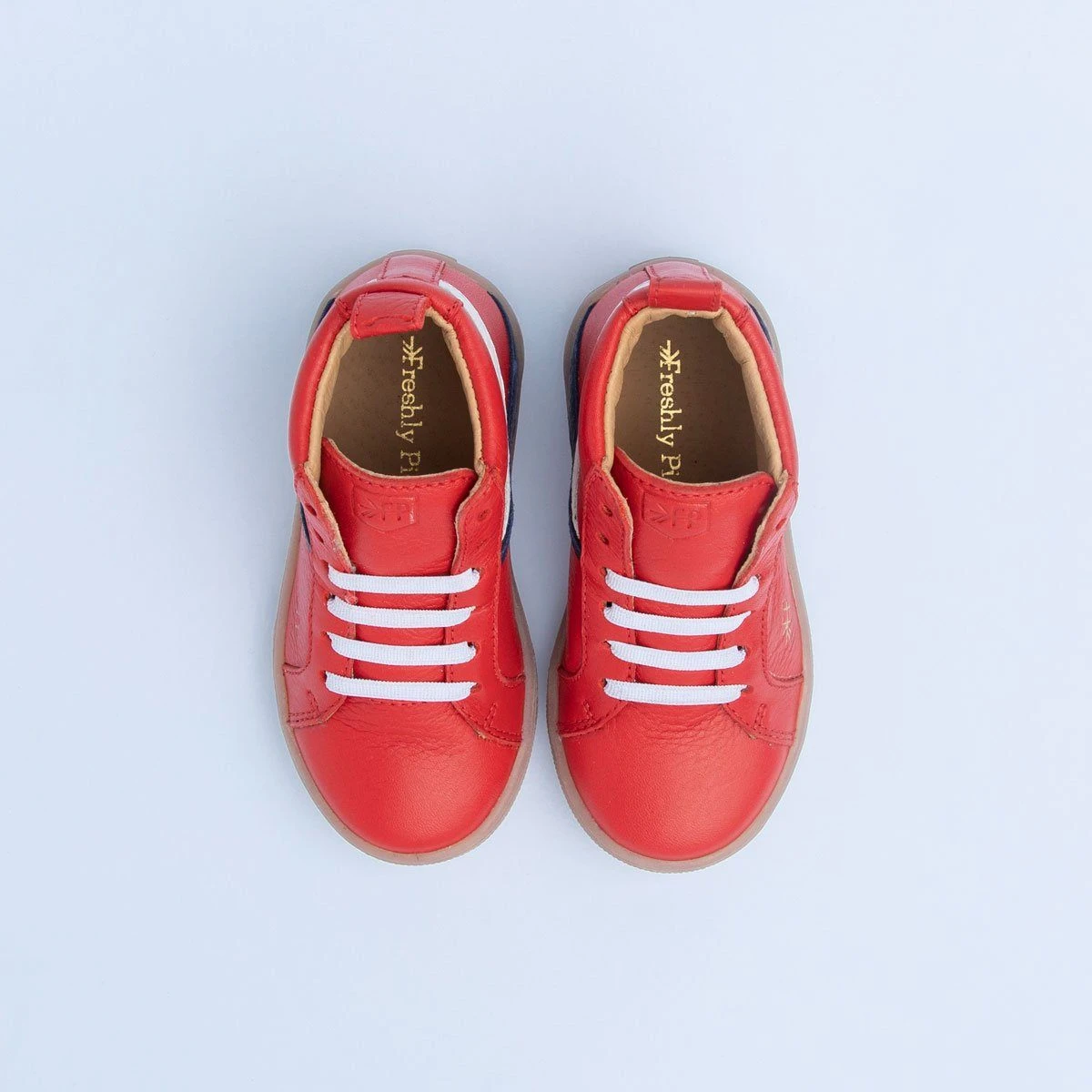 For the NEXT step in your kid’s life, we give you the re-imagined High Top Sneaker! Made of genuine leather exterior and leather lined, durable rubber soles, a back pull tab, and stretchy elastic laces make for an easy-on and off experience. Rock classic cool street style in these new High Top Sneakers!