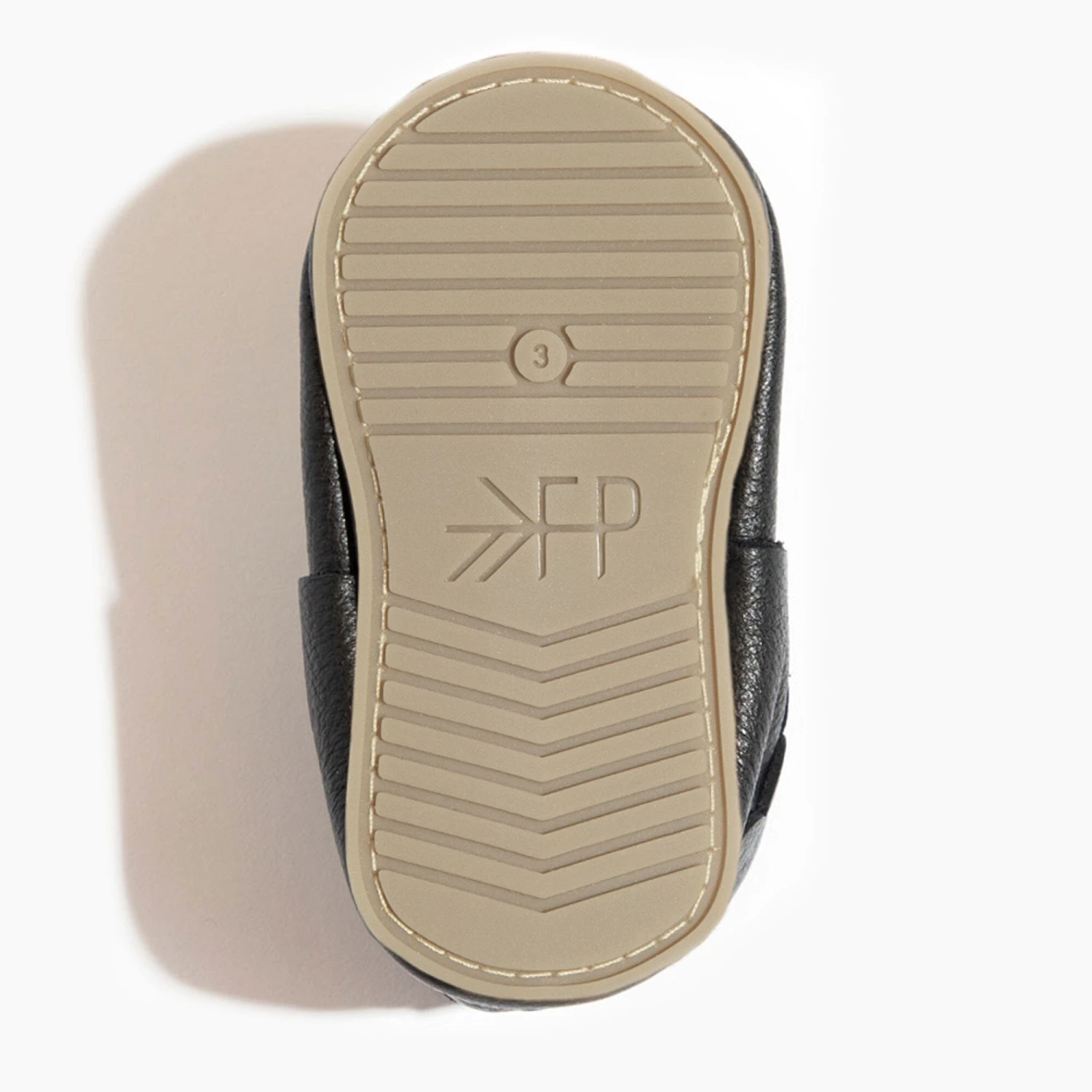 Our new bow moccasins feature a sweetly scalloped collar topped with a delicate bow. Made of with our favorite Ebony, full-grain leather on the upper and sole, designed to go with everything.