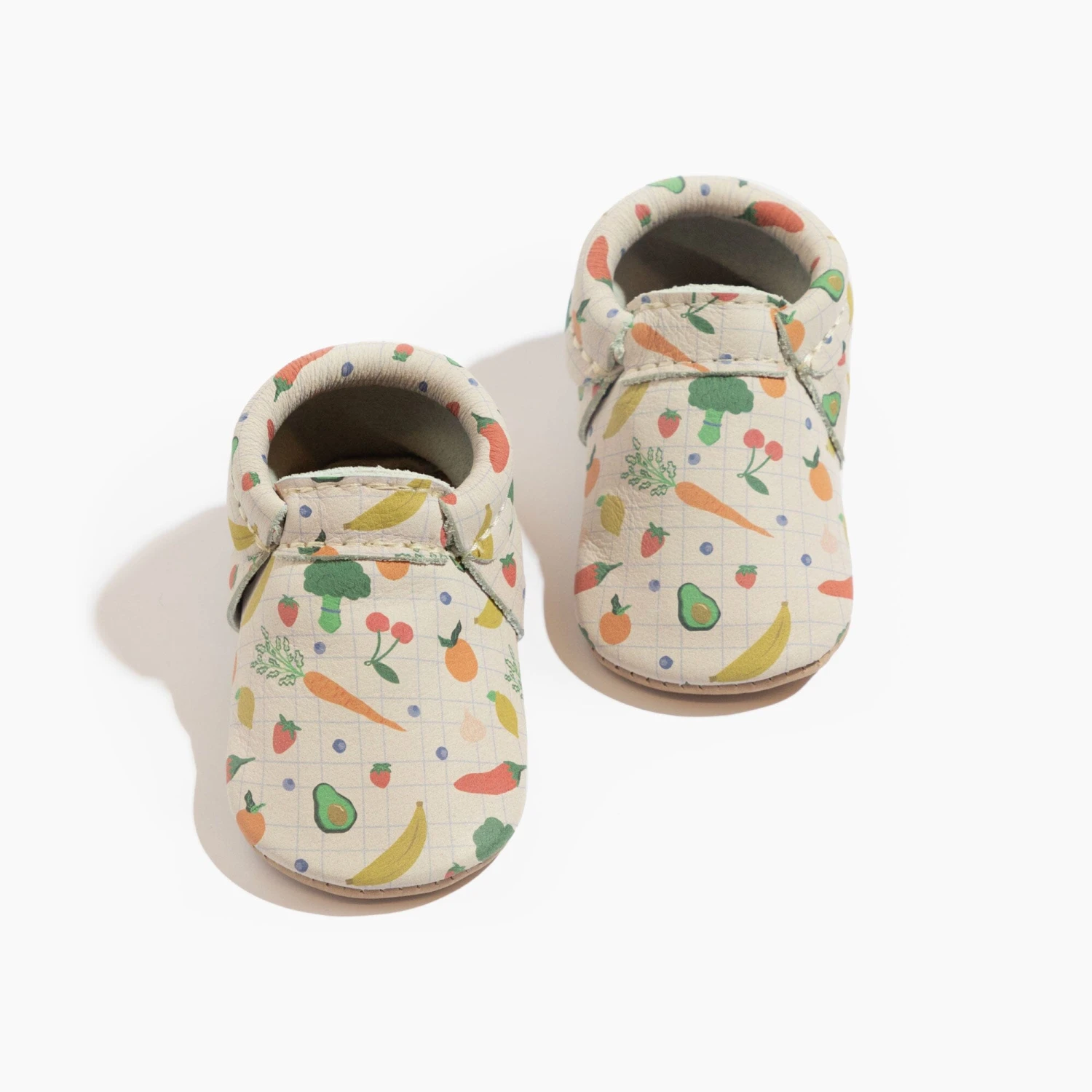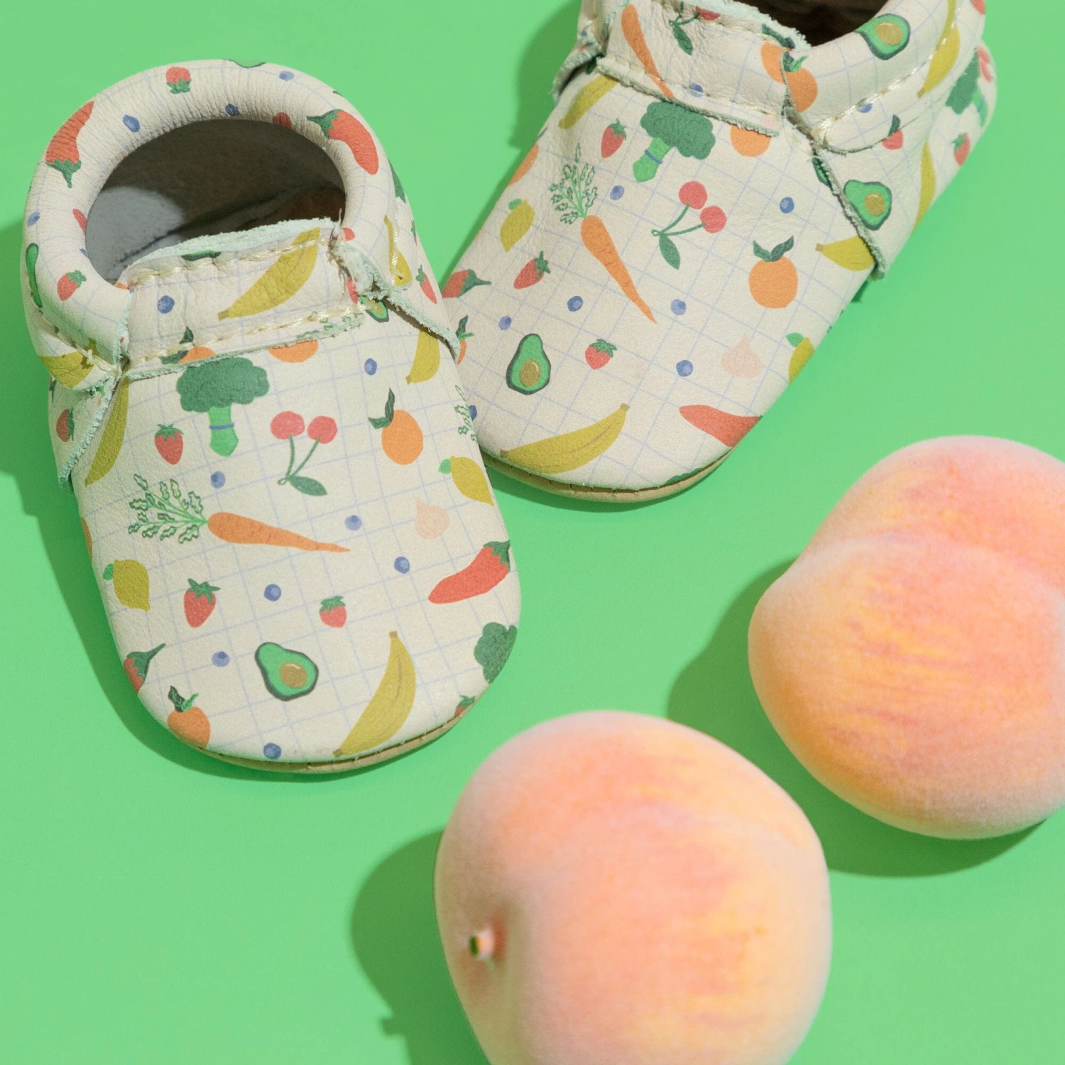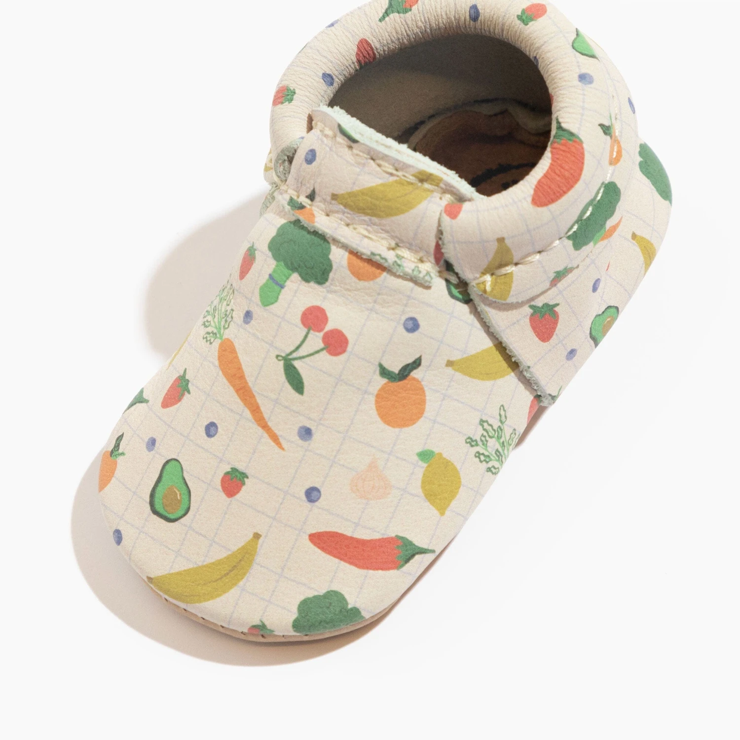 - Premium leather featuring a printed fruit and vegetable pattern