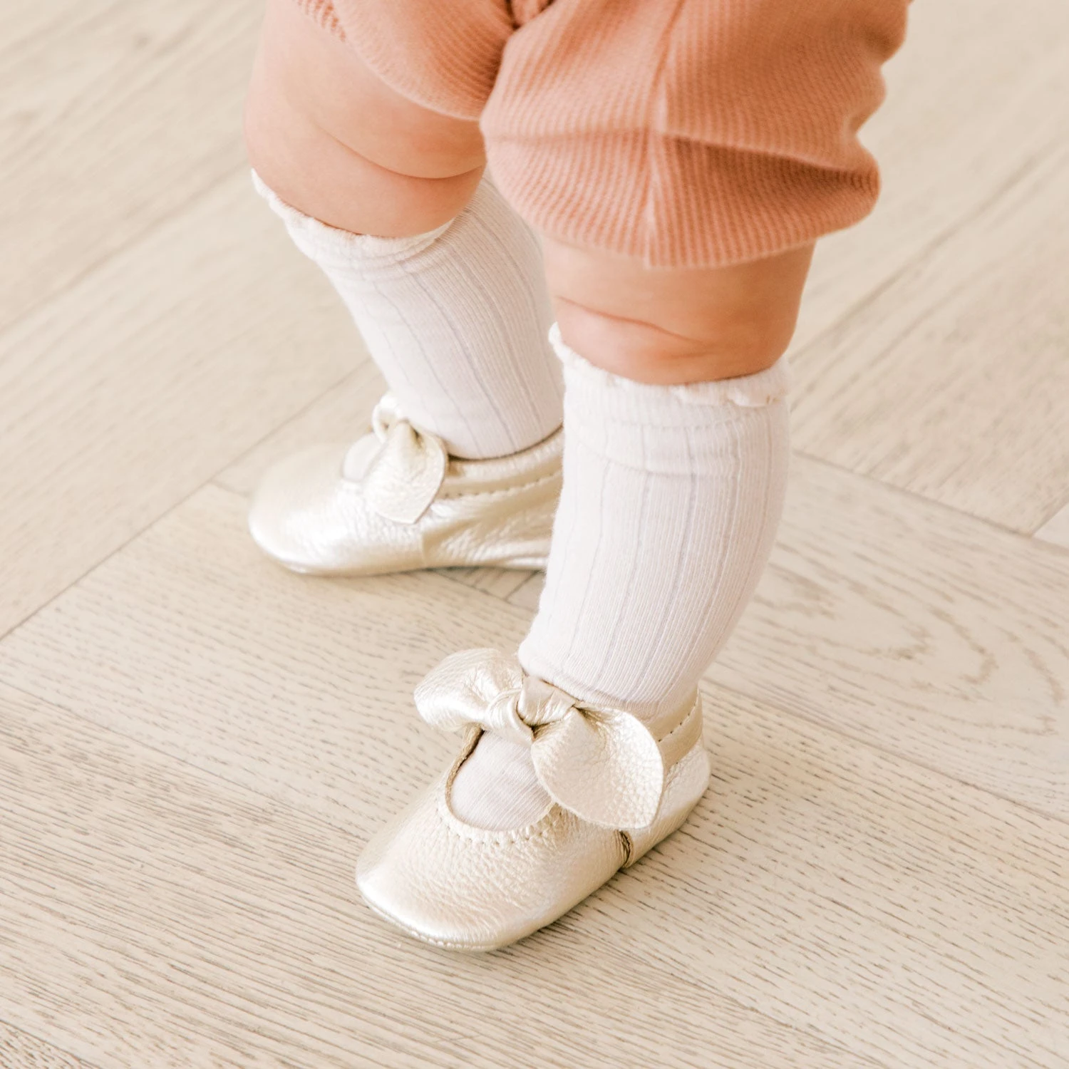Your little one will love our comfy socks! Easy to slip and designed to match our best selling moccasins. The scalloped detailing makes the pair super adorable and easy to outfit.