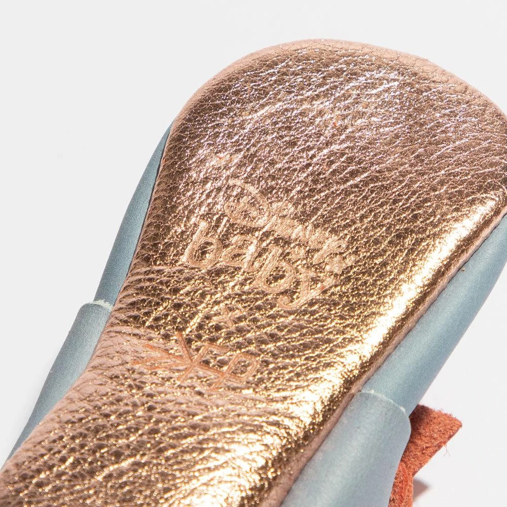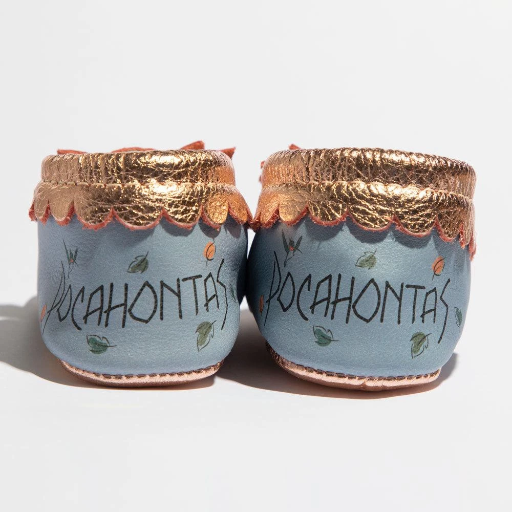 These princess shoes are filled with beautiful details and colors. A Pocahontas print on leather with a rose gold bow, scalloped collar, and sole!