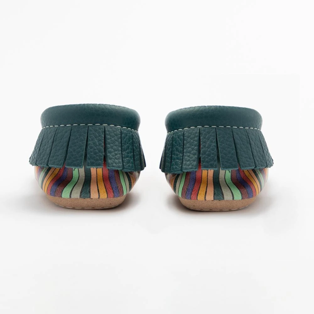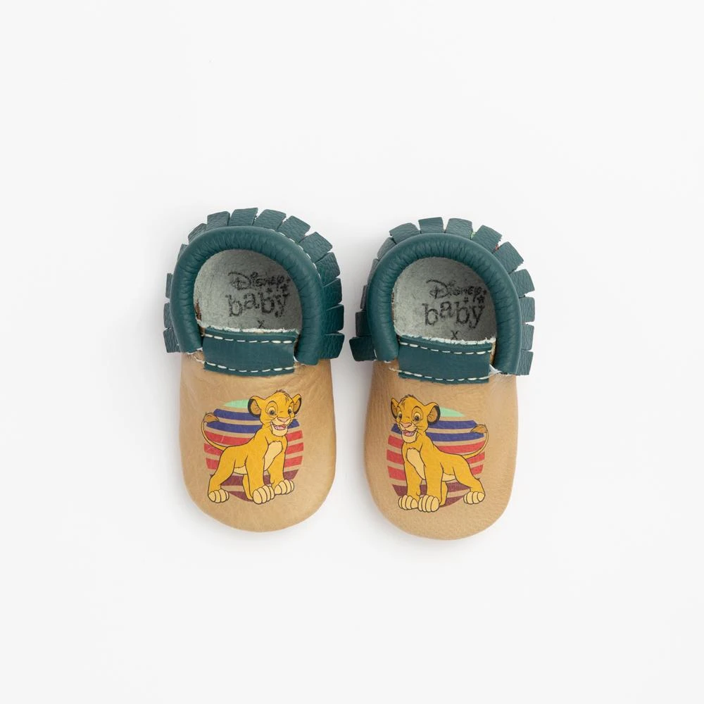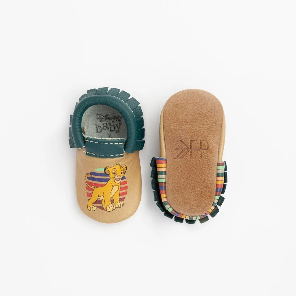 Simba moccs are here!!! In our biggest collaboration ever these Simba moccs are toooo good! This mocc comes with a nubuck leather toe with Simba printed on the front behind a sunset with a night sky colored fringe, African striped bright patterned heel with weathered brown soles! Your lil king or queen need a pair of these!