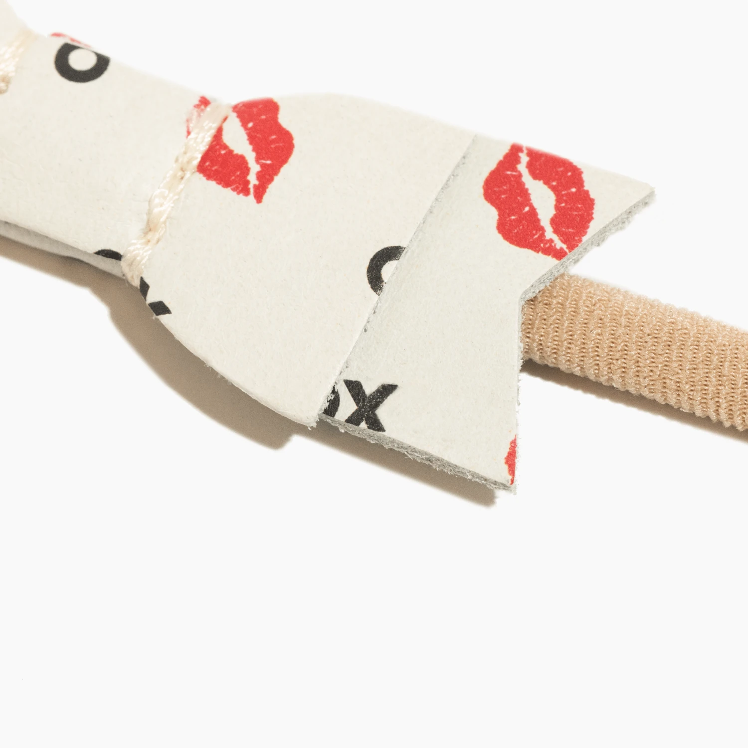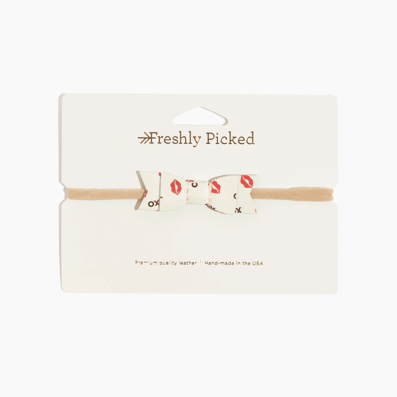 Dress up your littlest Valentine in this adorable hair bow! An allover XO + kissy lips design is printed on off-white leather. Debossed FP logo sits atop a thin nylon band for optimal comfort.